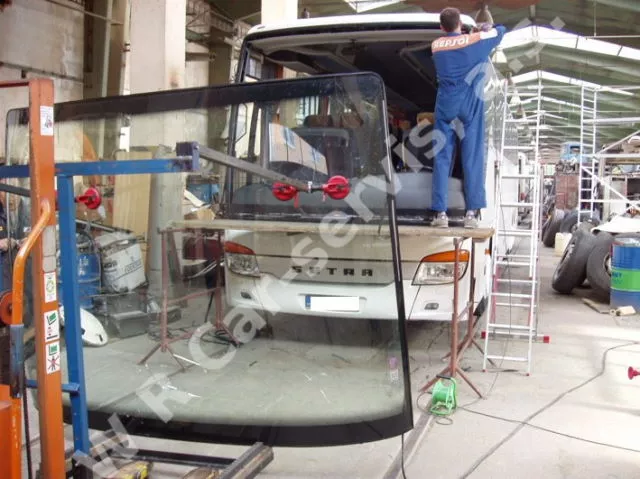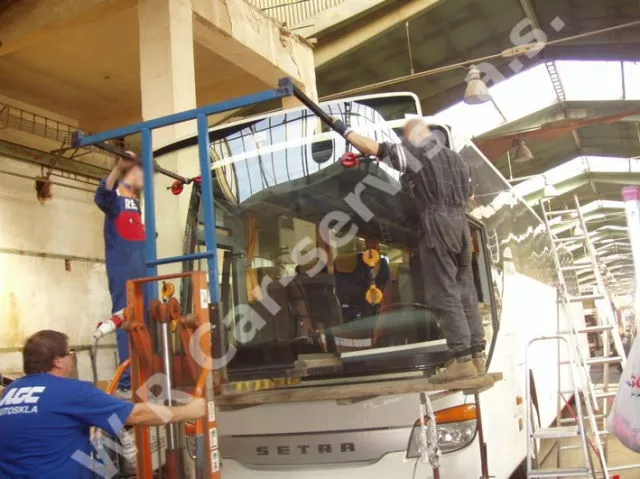 Díky mnohaletým zkušenostem při montážích autobusových skel máme možnost nabídnout svým zákazníkům vysoce profesionální servis, který vyřeší problém rozbitého skla autobusu. Máme k dispozici zařízení, které umožňuje přesné usazení velkoformátových skel do karoserie autobusu. Díky tomu není při montáži potřeba mnoho lidí, je zajištěn profesionální pohyb se sklem po uložení do karoserie a tím je eliminováno riziko ustřižení naneseného lepidla a následné zatékání do vozu. Nevznikají vzduchové kapsy, které snižují pevnost namontovaného skla a tím se eliminuje riziko následného samovolného poškození skla při provozu autobusu.